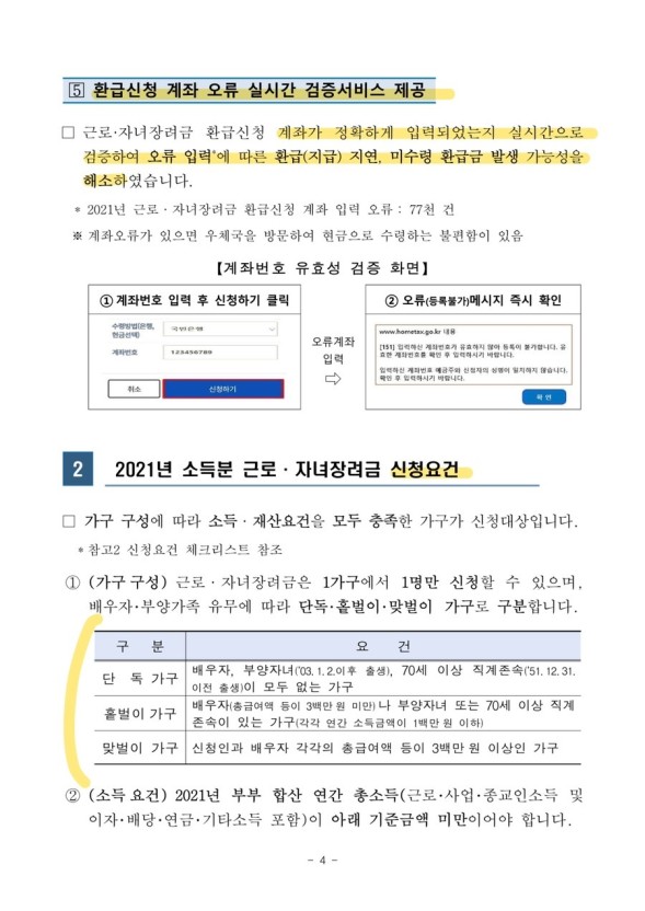 2022년 부터는 근로장려금 지급과 관련하여 개정되는 내용이 있습니다. 물론 이미 알고 계신 분들도 많으시겠지만 5월 1일부터 정기신청이 시작되기 때문에 신청전 달라지는 내용 꼭 확인하셔서 신청하시면 도움이 될거 같습니다.