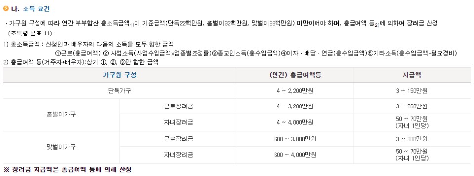 | 근 로 장 려 금 | 3만원 ~ 150만 원 | 3만원 ~ 260만 원 | 3만 원 ~ 300만 원 |