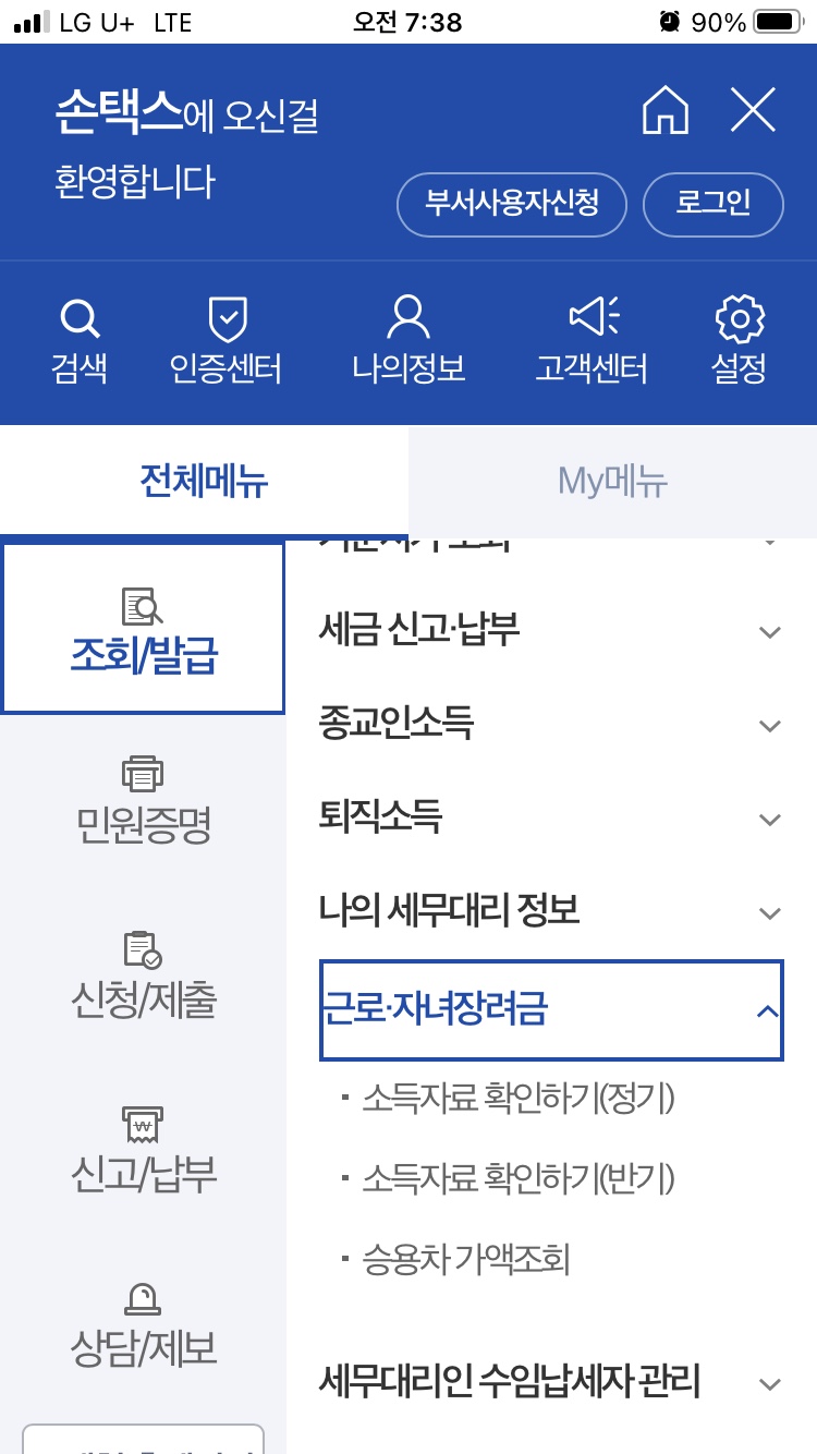 1. 모바일 홈택스에 접속하고 근로 장려금 신청메뉴에 들어갑니다.