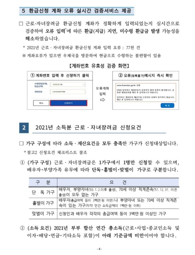2022년 부터는 근로장려금 지급과 관련하여 개정되는 내용이 있습니다. 물론 이미 알고 계신 분들도 많으시겠지만 5월 1일부터 정기신청이 시작되기 때문에 신청전 달라지는 내용 꼭 확인하셔서 신청하시면 도움이 될거 같습니다.